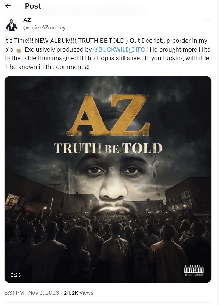 New York rapper AZ will be releasing a new album in 2023. Titled Truth Be Told, the album will release December 1st. The album has been confirmed to be fully produced by Buckwild of Diggin’ in the Crates fame.