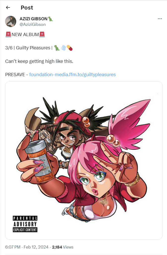 LA rapper Azizi Gibson will be releasing a new album in 2024. Titled Guilty Pleasures, the album will release March 6th. The pre-save for the album is available now.