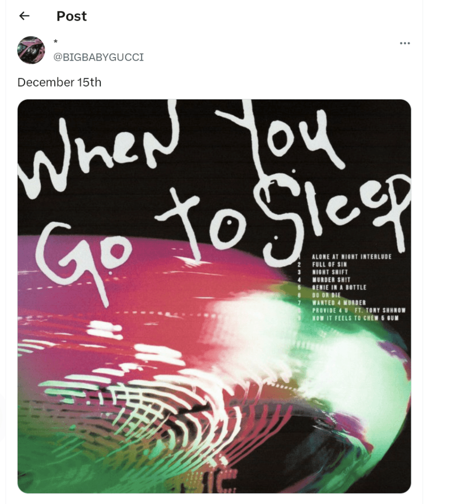 North Carolina rapper BigBabyGucci will be releasing a new EP in 2023. Titled When You Go to Sleep, the EP will release December 15th. The EP’s lone feature will be from Tony Shhnow.