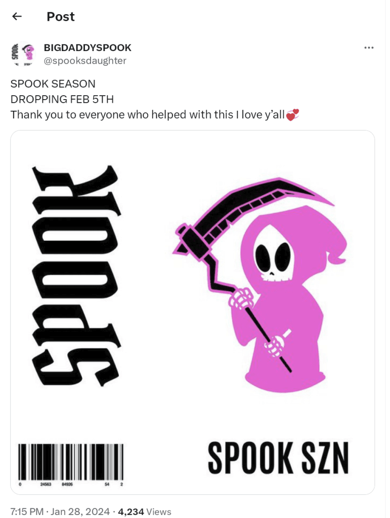 BigDaddySpook aka Spook will be releasing a new project in 2024. Titled SPOOK SEASON, the project will release February 5th. It is unconfirmed if this project will be an EP or an album.