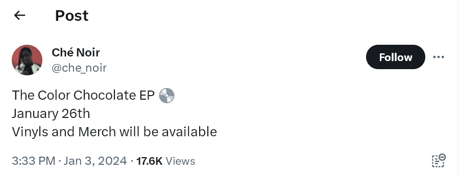 Buffalo, New York MC Ché Noir will be releasing a new EP in 2024. Titled The Color Chocolate, the EP will release January 26th. As stated via Twitter, there will also be vinyls & merch for the project available.