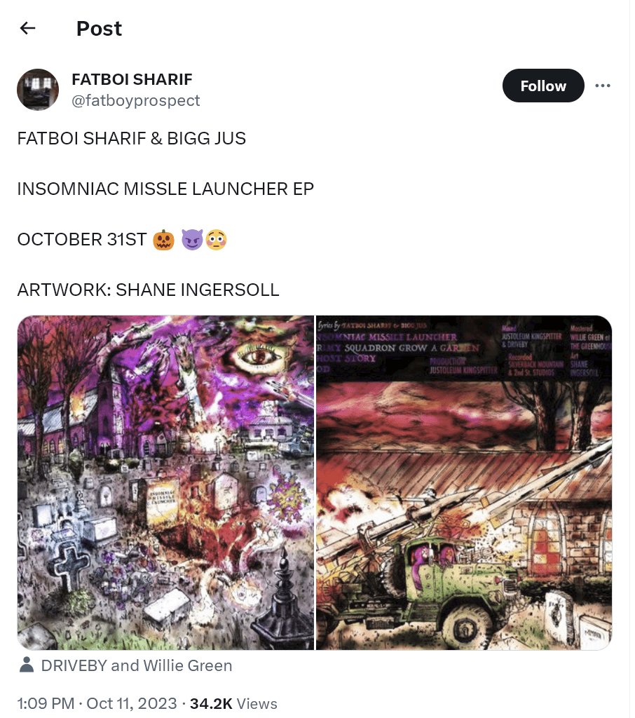 New Jersey rapper Fatboi Sharif will be teaming up with former Company Flow member Bigg Jus for a new EP in 2023. Titled Insomniac Missile Launcher, the project will release October 31st. Production for the EP will be handled by Justoleum Kingspitter.