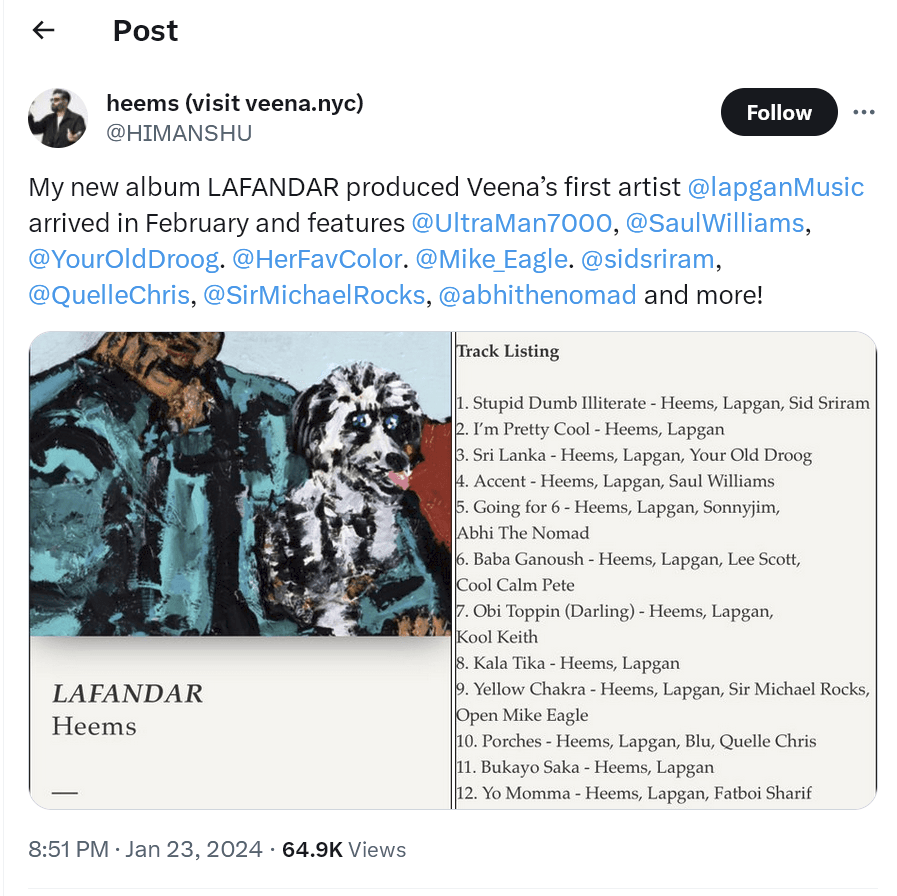 Former member of Das Racist, Heems will release a new album in 2024. Titled Lafandar, the album will release February 16th. Features on the album include Sir Michael Rocks, Open Mike Eagle, Quelle Chris and more.