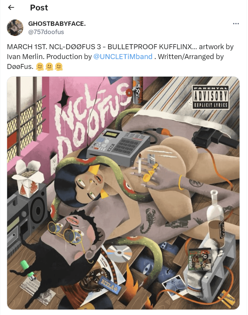 Richmond, Virginia artist Døøf will be working London producer NCL-TM for a new album in 2024. Under the name NCL-DØØFUS, the duo will release the album March 1st. The artwork for the album was done by Ivan Merlin.