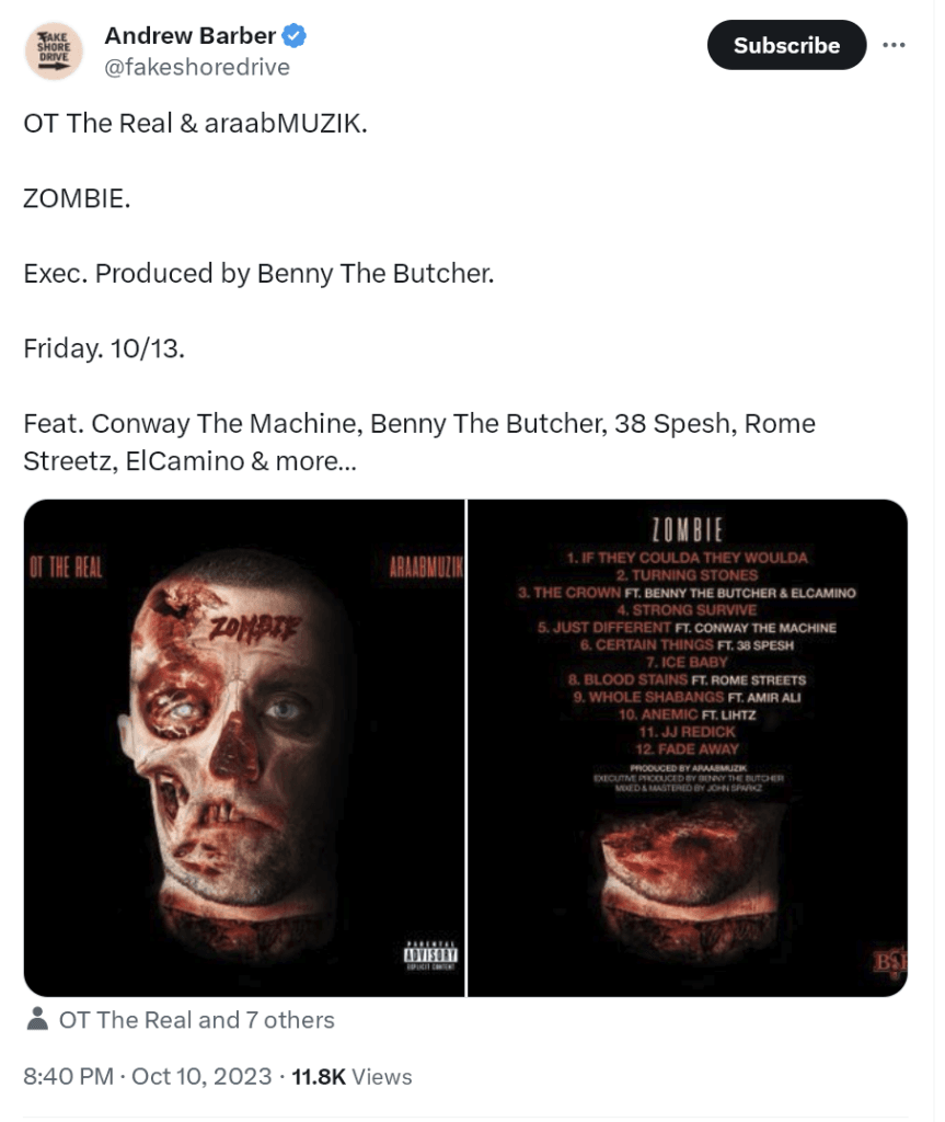 Philadelphia, Pennsylvania rapper OT The Real will be releasing a new album with producer araabMUZIK in 2023. Titled ZOMBIE, the album will release October 13th. Features on the album include Benny the Butcher, Elcamino, Conway the Machine and more.