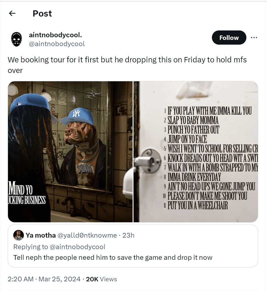 New York rapper RXKNephew will be releasing another new album in 2024. Titled Mind Yo Fucking Business, the album will release March 29th. The album will be eleven tracks long, with no features.