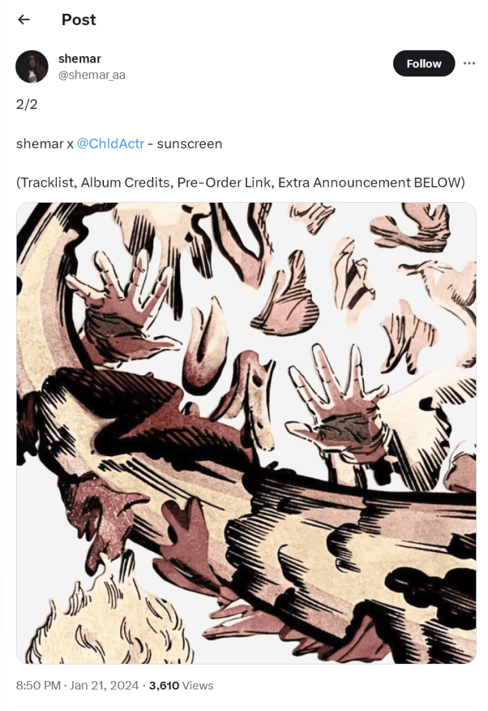 Brooklyn, NY rapper shemar will be releasing a new album with indie pop group Child Actor in 2024. Titled sunscreen, the album will release February 2nd. Features on the album include burning macaw, baegull, Jay Cinema and more.