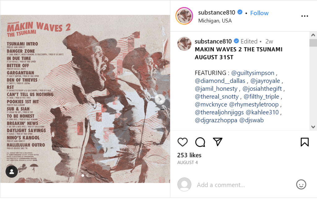 Michigan rapper Substance810 will be releasing another album in 2023. Titled Makin Waves 2: The Tsunami, the album will release August 31st. Features on the album include Mickey Diamond, Snotty, Guilty Simpson and more.