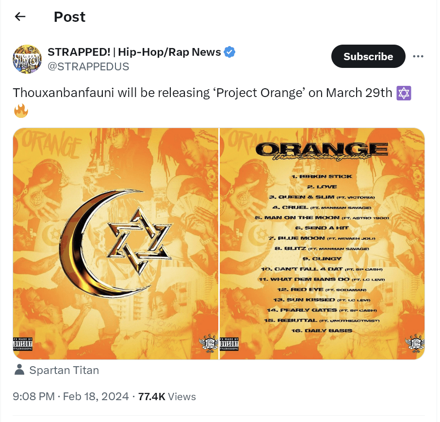 Atlanta rapper Thouxanbanfauni will be releasing a new album in 2024. Titled Project Orange, the album will release March 29th. Features on the album include ManMan Savage, UnoTheActivist, Astro 1900 and more.